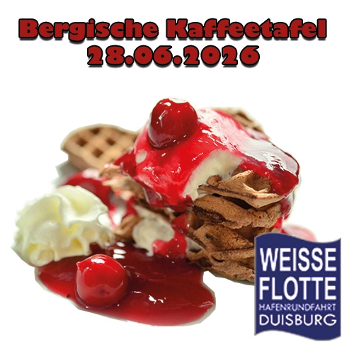 Die Bergische Kaffeetafel beinhaltet: Heiße Waffeln mit Kirschen und Sahne, Milchreis mit Zimt & Zucker, Stuten, Schwarzbrot, Marmelade, Butter, rohen Schinken, Käse, Mettwurst. Zusätzlich ist der Kaffee inklusive.